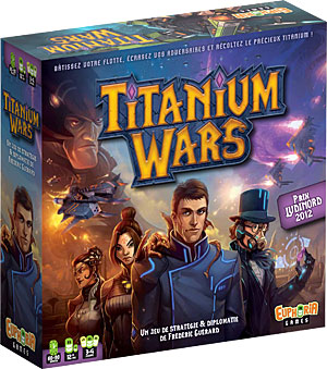 Titanium Wars de Frédéric Guérard pour 3 ou 4 joueurs à partir de 12 ans (durée moyenne : 60/90mn). Les illustrations sont de Alexey Yakovlev, Igor Polouchine, Caroline Hirbec, Matthieu Rebuffat.
