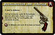Le joueur qui possède le plus de personnages "Baroudeur" dans son camp, s'empare de la carte "Bourlingueur sans Scrupule" et la place dans son camp. Il peut dès lors, et à chaque tour, utiliser l'action associée à cette carte : Défausser une carte au hasard de la main de l'adversaire.