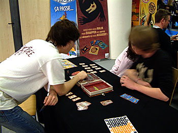 Nous préférons faire notre premier arrêt à cette table de Du Balai! où l'animateur qui arrive au terme de ses explications, nous propose de participer à une petite partie de l'as d'or/jeu de l'année 2007 avec les 2 joueurs déjà présents à la table.
