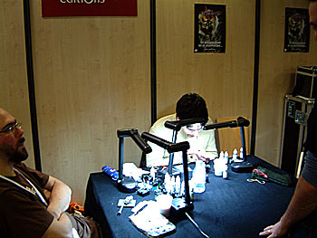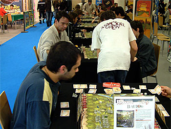 ...et il se tourne vers la table suivante où il va recommencer sa démontration à 2 autre joueurs. Les 6 tables de jeux visibles dans cette allée sont toutes dédiées à Battlelore.