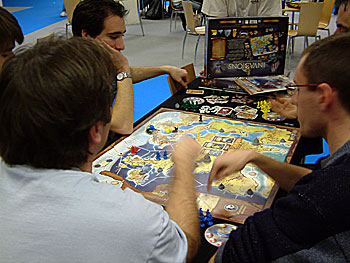 Du coté de Jactalea, il y avait du beau monde : on pouvait jouer avec Vincent Everaert sur son excellent Exxit, Claude Leroy était lui aussi très présent et nous présentait toute sa gamme comprenant Khan Tsin, Mana et le fabuleux Gygès. Enfin on pouvait pratiquer (et acheter bien sûr ) Kamon de Bruno Cathala, lequel Bruno était visible partout sur le salon (Je le soupçonne de s'être cloné pour l'occasion )..