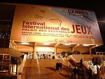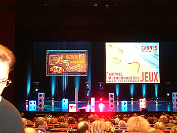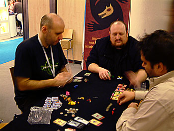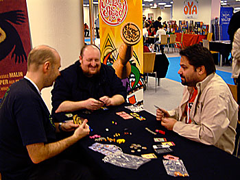 Sur le stand des Editions du Matagot, Hicham et Ludovic Vialla sont en discution, juste le temps pour nous de les saluer, pour la démo on reviendra demain, ce soir c'est trop tard et la soirée gala c'est pour bientôt...