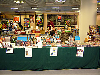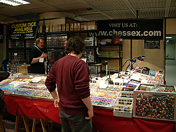Bien Le samedi matin, nous sommes là à l'ouverture ! et c'est reparti, on va commencer par faire un tour du coté des jeu de figurines. Premier stand, celui de chessex : vous avez besoin d'un dé, alors si vous ne trouvez pas ici celui qu'il vous faut, c'est que vous êtes vraiment très difficile !