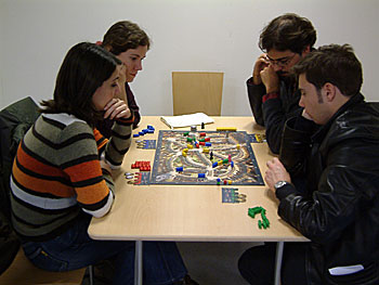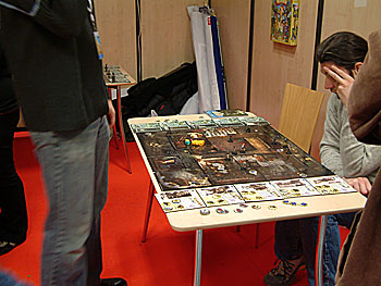 ...mais chez interlude il y a carrément foule ! Kezako accroche, dur pour s'approcher. Nous finirons quand même par y arriver et on pourra même y tester un proto de "Bonne question" en compagnie de Marco et sa femme et de Matthieu d'Epenoux. Le jeu n'est pas encore totalement finalisé, mais promet d'être fun et amusant...