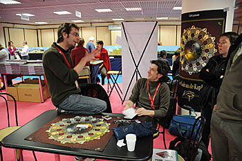 Cédric en pleine explication d'Yggdrasil, un jeu coopératif basé sur l'univers de la mythologie nordique, sur lequel je suis co-auteur (bah oui et en toute modestie, c'est un bon jeu ).