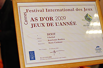 Chez Libellud, forcément on est heureux, Dixit est l'as d'or/jeu de l'année 2009 et franchement ça fait du bien de voir un jeu frais et joliment illustré l'emporter. Les visuels de Marie Cardouat ont un style naïf que le jeu porte comme un gant, le mécanisme est épuré et facile d'accès. Un beau vainqueur !