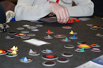 Ad Astra, le jeu de Serge Laget et Bruno Faidutti. Le jeu comporte une phase de programmation et une phase de résolution où tous les joueurs jouent les actions programmées, nous prenons une option sur la partie suivante...
