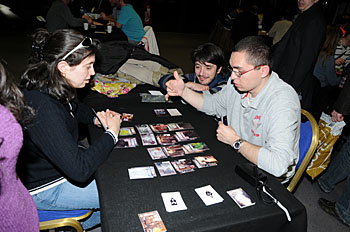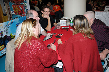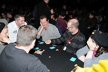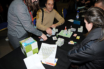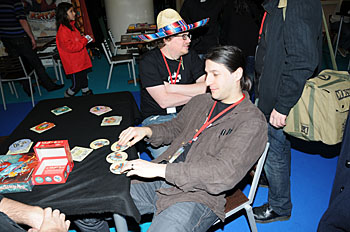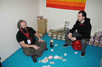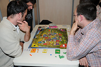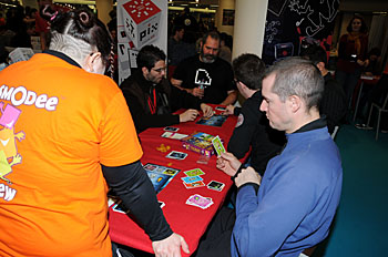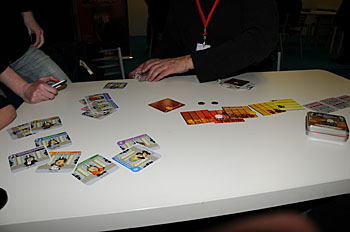 Bruno Faidutti faisait tourner sa dernière création. Mascarade (nom sans doute provisoire) est un jeu de bluff qui fonctionne bien et nous a bien fait rigoler. A sortir prochainement, le jeu étant déjà signé...