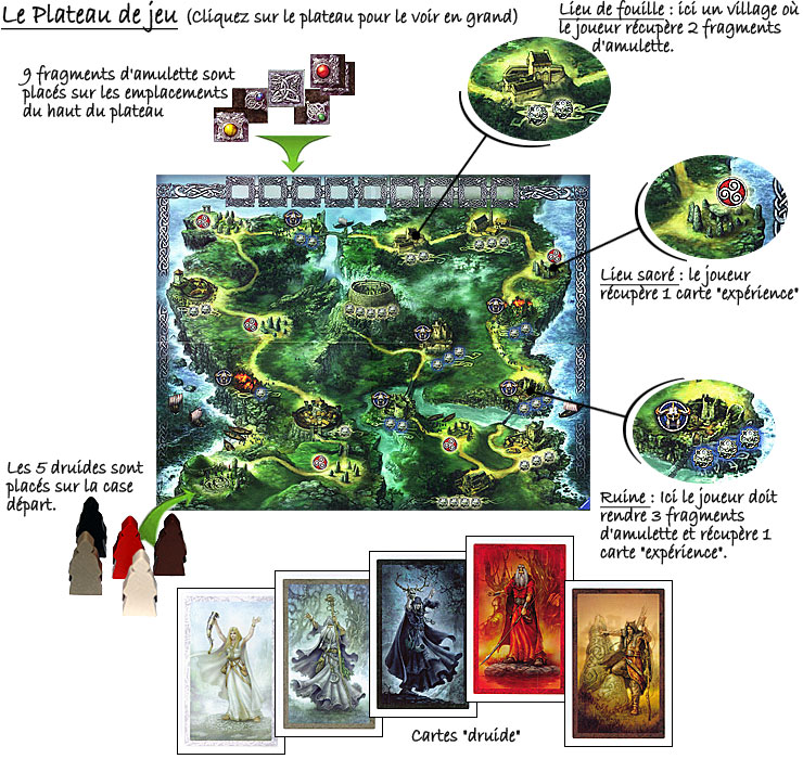 Le plateau, qui comporte 19 lieux formant un parcours relié par un chemin unique, est placé au centre de la table. On positionne les 5 druides (en bois) sur la case de départ, puis on constitue, après avoir mélangé les cartes séparément, une pioche de cartes "druide" et une pioche de cartes "Expérience" que l'on positionne à côté du plateau.