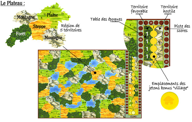 Le plateau de jeu est divisé en 60 zones formant 12 régions avec 4 types de terrains (montagne/forêt/steppe/prairie), 5 clans isolés vont essayer d'y fonder leurs premiers villages.