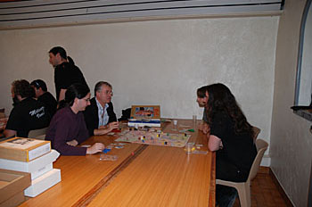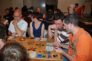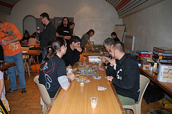 ...des tables où l'on joue (ici en haut : Mathieu et Cédric qui s'affrontent sur Gosu, en bas : Serge Cécile, Bruno et Maëva qui jouent à In Nomine Domino de Bruno Faidutti et Dr Mops)...
