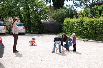 Dehors, une délégation constituée de Silas, Coralie, Anna, Claire et Damien s'est lancée dans une partie de Mölkky.