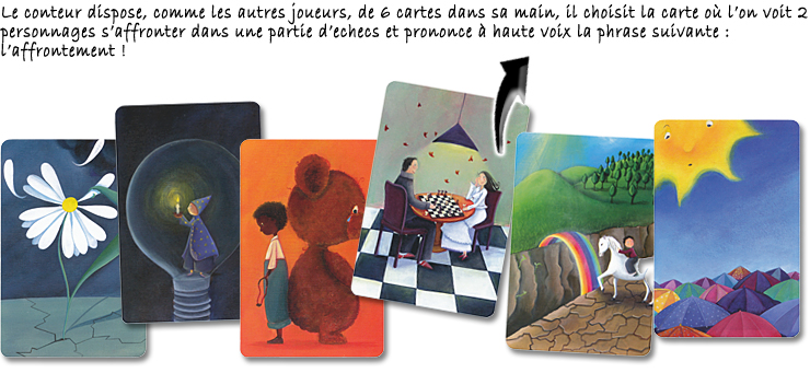 Le joueur dont c'est le tour joue le rôle de conteur. Il doit imaginer une phrase que lui inspire l'une des cartes qu'il a en main et l'énoncer à voix haute. Il peut s'agir du titre d'une oeuvre, d'une onomatopée, d'une phrase inventée, d'une extrait de chanson...seule limite : l'imagination ! chacun des autres joueurs choisit alors une de ses cartes qui pourrait illustrer au mieux la phrase choisie par le conteur et la donne à ce dernier. Lorsque tous les joueurs ont fait leur choix, le conteur mélange les cartes récoltées avec la sienne et les dispose, face visible, sur la table, la plus à gauche sera la carte 1, la suivante sera la 2 et ainsi de suite.