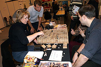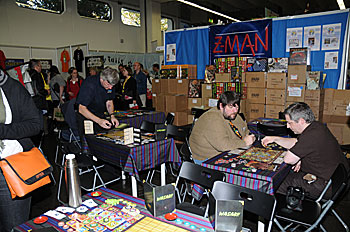 Du côté de Z-Man Games, nous avons testé Wasabi, un petit jeu pas très passionnant où l'on doit réaliser des recettes en plaçant des ingrédients sur un plateau quadrillé, bof bof. Nous avons pu nous essayer aussi à Heads of State, qui lui est doté d'une mécanique sympathique mais d'une édition catastrophique, avec en point d'orgues le plateau et les tuiles personnages qui viennent se placer dessus qui sont illisibles, ce qui tue un peu la jouabilité et plombe totalement un jeu qui serait pourtant un poids moyen sympathique sans ces écueils...dommage !