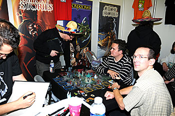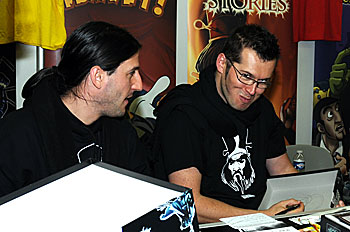Marco et Matthieux d'Epenoux se font des politesses sur le stand de Cocktail Games.