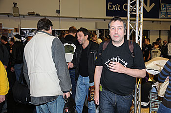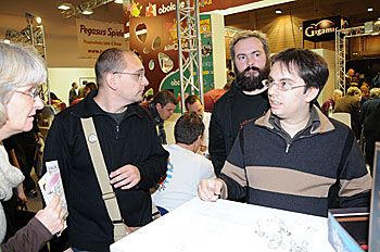 Les auteurs des Loups-Garous, Philippe des Pallières (de dos à gauche) et Hervé Marly (au centre) sont là, en compagnie du Dr Mops (à droite)...