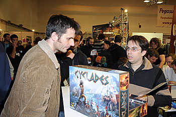 Juste en face des portes, le stand Matagot, avec en vedette Cyclades. Hicham et Alexandre Roche discutent peut-être d'une future collaboration...