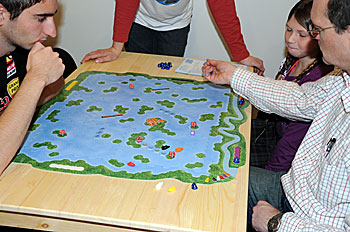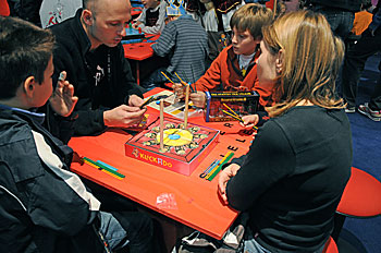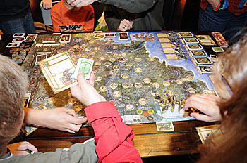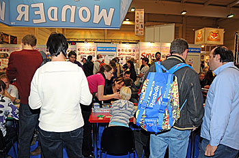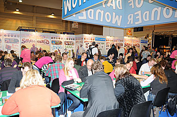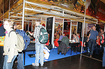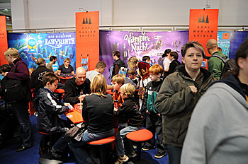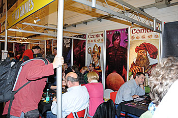 Chez Days of Wonder, c'est Smallworld qui est à l'honneur, un grand nombre de tables étaient mises à disposition pour tester cet excellent jeu et l'on pouvait acheter les 2 petites extensions sorties pour l'occasion. Bien sur on pouvait s'essayer aussi à d'autres jeux de l'éditeur, comme l'incontournable Aventuriers du Rail, (Zug um Zug dans la langue locale ) avec l'extension 1912.