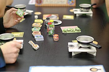 A la Carte (en français dans le titre !) est un jeu léger d'adresse très rigolo. Il faut placer les bons ingrédients dans sa casserole, en respectant les quantités, pour réaliser des recettes et gagner des étoiles. Nous l'avons testé en compagnie de Ludo qui s'est révélé très habile dans l'exercice et a remporté la partie (notez que je finis bon dernier, malgré une bonne crêpe Suzette de dernière seconde). Un bon moment de rigolade...