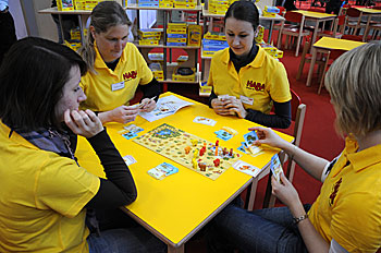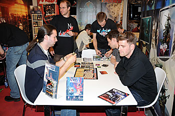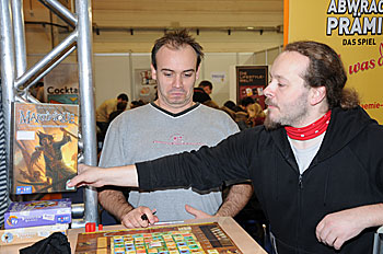 Mathieu, Gaby et moi, pris par la patrouille, en train de jouer à Wazabi sur le stand de Gigamic. Victoire de Gaby...