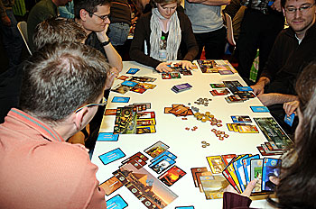 Alors ça, pour sûr, c'est LE jeu de cette édition 2010 ! 7 Wonders c'est un nombre impressionnant de boites qui auront été vendues, avec déjà 777 boites précommandées avant même l'ouverture. Le petit dernier d'Antoine Bauza fait mouche : le jeu est plutôt simple d'accès, tout en proposant plusieurs voies tactiques réajustables en fonction de ce que font nos adversaires. A 7 Wonders, il faut s'adapter et faire le bon choix à chaque tour, tout en surveillant ses adversaires directs, pour espérer l'emporter. Du tout bon !