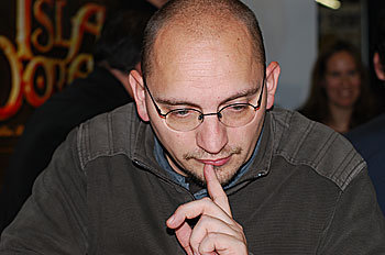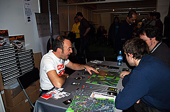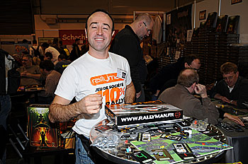 Aaaah Rallyman, un jeu génial et un auteur génial ! JCB c'est une pile électrique qui explique inlassablement et avec entrain le principe de son jeu...Et en plus il a un beau tee-shirt Rallyman ! (mais il ferme les yeux quand on le prend en photo, va falloir rectifier ça JC ! )