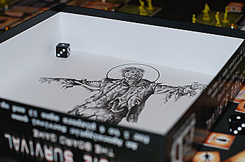 Le système de tir original de Zombie Survival : Chaque arme donne un certain nombre de dé à 6 faces qu'on lance dans la boite, à l'intérieur de laquelle est dessiné un zombie. Un dé dans ou sur le cercle autour de la tête et c'est un head shot ! on peut aussi buter le zombie en le touchant sur une autre partie du corps avec un 6. Sur la photo, je viens de foirer lamentablement avec mon revolver (1 dé 6).