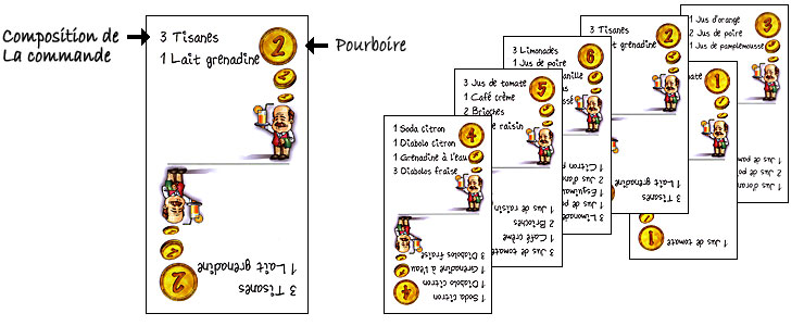- Servir sa ou ses commandes : Le serveur donne au meneur de jeu ses cartes "commande" et doit lui énoncer le détail de chacune d'entre elles, pour chaque commande correctement servie, il gagne le pourboire associé à la carte.