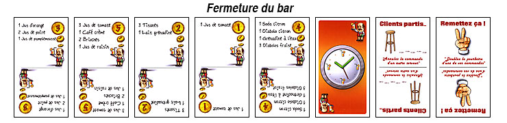 Lorsqu'on introduit la carte "horloge" le but sera d'être le serveur qui possède le plus de pourboires à la fermeture du bar. On place, en début de partie, la carte "horloge" à gauche des 5 cartes "commandes".