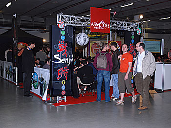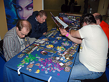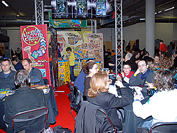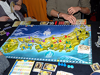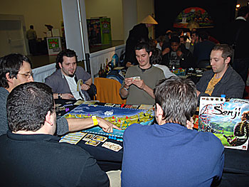 ...où l'on trouvera un grand nombre de tables dédiées à la nouveauté toute fraîche sortie pour la Gencon : Senji de Bruno Cathala et Serge Laget, et sous la demande pressante des joueurs qui seront très nombreux à se presser sur le stand pour le tester, le nombre de tables dédiées à Senji ne cessera d'augmenter tout au long du WE.