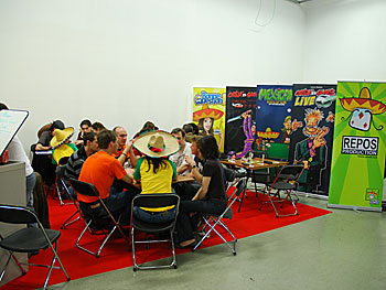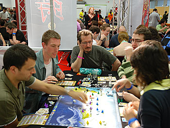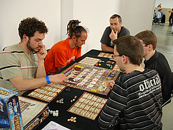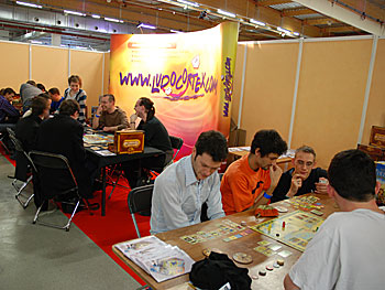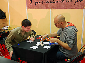Chez Ludocortex on pouvait tester Thèbes (en avant plan), un jeu de "fouilles" qui simule bien la lenteur du travail d'archéologue...nous nous sommes beaucoup ennuyés...