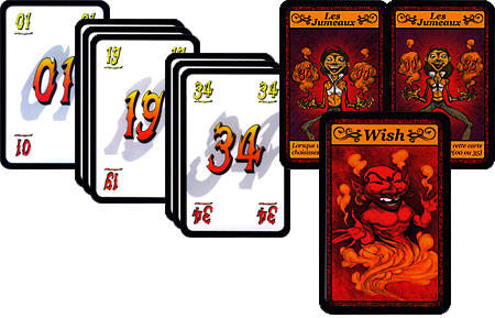 Pour jouer, on utilisera le jeu de cartes numérotées de 1 à 34, les 2 cartes jumeaux 0-35 et la carte Wish (hormis à 3 joueurs où l'on se servira des cartes numérotées de 1 à 19, des jumeaux 0-20 et de la carte Wish).