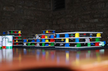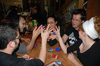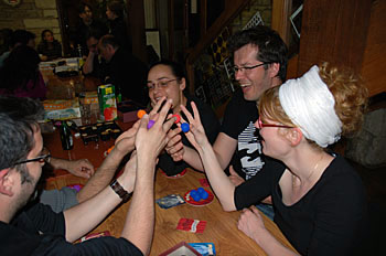Handy un jeu de mains avec des boulettes de couleur (qui a dit jeux de mains jeux de vilains ?), le principe est simple et mortel : les joueurs doivent tenir les boulettes, que l'on rajoute une par une, avec les doigts désignés par les cartes. Une boulette qui tombe est perdue, le joueur qui se retrouve sans boulette à perdu...