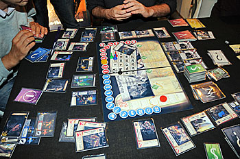 Nous avons testé Nostra City, en compagnie de l'un des auteurs, sur le stand d'Hazgaard. Le jeu nous fait endosser le rôle d'un lieutenant d'un parrain de la mafia, qui se trouve en prison. Notre mission sera de le faire innocenter...à moins que l'on ne décide de faire cause commune avec le FBI, tout en s'en mettant plein les poches . Jouer les caïds, faire du racket ou du trafic en tout genre ou bien encore lancer des Vendettas sur ses collègues de jeu qui sont peu respectueux de leur parole : c'est un vrai régal, ambiance garantie !