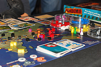 Direction le stand Filosofia pour tester l'extension de Pandémie. Elle propose de nouveaux personnages avec de nouvelles capacités, ainsi que trois variantes, dont une nouvelle maladie (violette) et des cartes épidémies spéciales avec des effets pour la souche violette, ainsi que 4 maladies mortelles qu'il faudra gérer. L'extension permet aussi de jouer à 5...