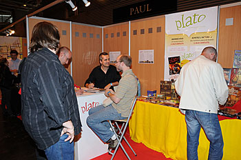 Sur le stand de Plato, l'accueil est toujours chaleureux et en plus on pouvait discuter jeux avec Didier et Marie !