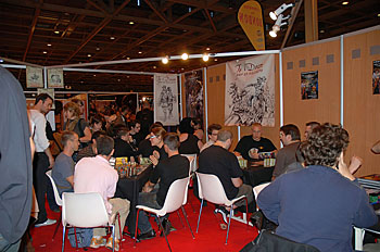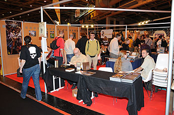 Chez Matagot, Il y avait pas mal de nouveautés à découvrir, l'éditeur étant présent sur plusieurs fronts : tout d'abord le tout récent Hytericoach, mais aussi Cœur de Jade, un roman d'aventures se déroulant dans la Chine Antique et surtout la réédition de Te Deum Pour un Massacre, le jeu de rôle des guerres de religion que beaucoup attendaient avec impatience. Cerise sur le gâteau : Rolland Barthelemy était là pour dédicacer les exemplaires avec de superbes illustrations...