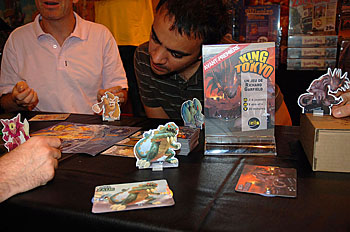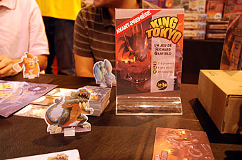 ...on enchaîne dans la foulée avec un King of Tokyo, un jeu de Richard Garfield (Mr Magic !). Les règles sont simples, chaque joueur dirige un méchant monstre qui n'a qu'une idée en tête : mettre Tokyo à feu et à sang (et accessoirement buter ses copains monstres). Pour ce faire, on dispose de 3 jets des dés pour faire ses choix (points/énergie/dégâts/points de vie), de plus, des cartes spéciales peuvent êtres achetées grâce à l'énergie et viennent perturber l'ordre établi. Le truc c'est que le premier joueur qui choisi de faire des dégâts reste en place sur Tokyo : De là, il fait des dégâts sur la ville et sur tous ses camarades de jeu en même temps, mais subit, tant qu'il reste sur Tokyo, les dégâts de tous les autres joueurs...Un jeu que l'on peut jouer bien bourrin comme je les aime ! Nous avons passé un bon moment...