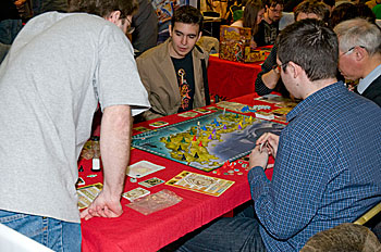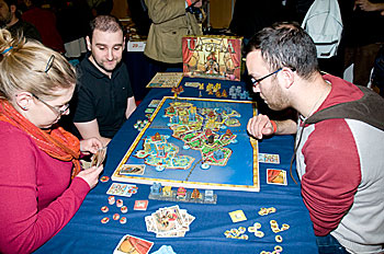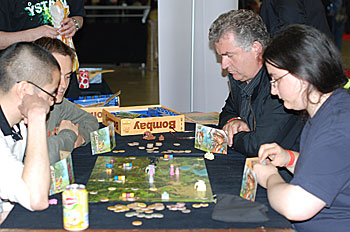 Le samedi après midi se déroulait le concours Trader, L'Ystari Team composée de Cyril Demaegd (ici à droite sur la photo) associé à William Attia atteindra la finale où elle sera battue par l'Asmodée Team (Gaubil/Nunes).