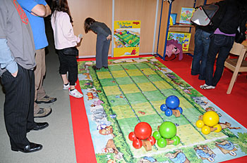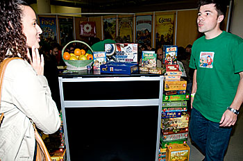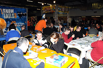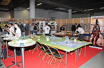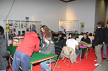 Le Stand de la ludothèque de Boulogne, en avant plan une partie de Tumblin Dice en cours...