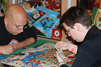 Dice Town : le joueur de droite semble très absorbé par la lecture de sa carte.