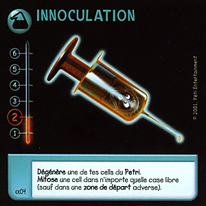 Activer : Pour pouvoir être activée, une Cellule doit être chargée, c'est à dire être présente dans le Pétri et s'y trouver face cachée. Si la Cellule possède un effet secondaire, celui-ci est obligatoirement appliqué. Après son activation, la Cellule reste désactivée, face visible, dans le Pétri.