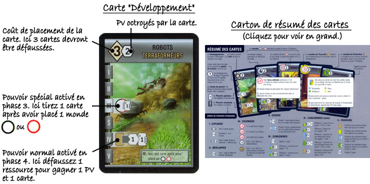 IV : Consommer : tous les joueurs doivent défausser les ressources présentes sur leurs mondes (cartes faces cachées) pour les consommer. Il faut pour cela utiliser les pouvoirs de consommation présents sur les cartes mondes et développements. Ils gagnent alors des PV et éventuellement des cartes.