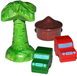Déposer les décors : 4 huttes, 3 palmiers et 3 statues en respectant ces règles :