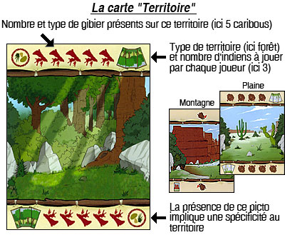 - Pour chaque territoire en jeu où le nombre d'indiens à jouer est atteint, on compare la valeur de combat totale de guerriers de chaque joueur, celui qui a la plus élevée remporte la carte "territoire" (on applique ici les modifications éventuellement apportées par le picto du territoire s'il est présent), qu'il prend et place devant lui, face visible. Pour chaque animal présent sur la carte il gagnera , en fin de partie, un point de victoire supplémentaire.