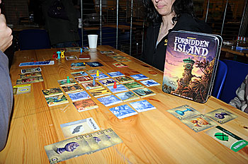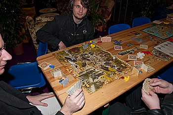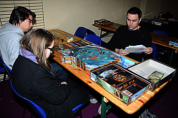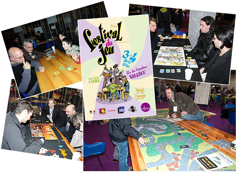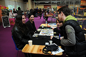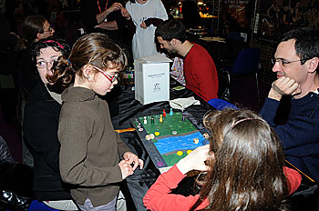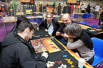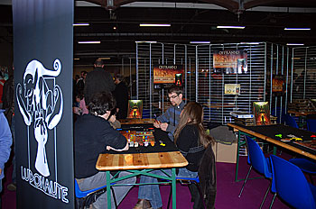Un petit tour chez Ludonaute, où tournait Offrandes, à droite, Bruno Cathala, qui s'essaye à la bête...