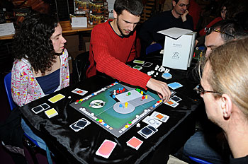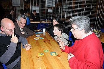 Nous en avons profité, par la même occasion, pour essayer Speech en compagnie de Matthieu d'Epenoux, François Haffner et Cédric, un excellent petit jeu d'improvisation qui sait rester accessible au plus grand nombre. Ici un duel verbal entre Cédric et François qui se soldera par une belle victoire de François, et pourtant Cédric, il n'est pas mauvais quand il s'agit d'improviser !