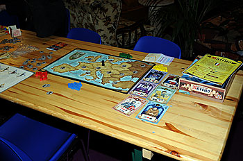 Une table pour s'essayer à Rattus, un jeu méchant où il faudra combattre la Peste noire véhiculée par les rats en Europe au XIVe siècle.