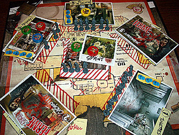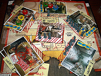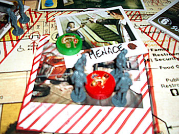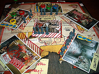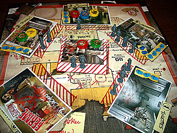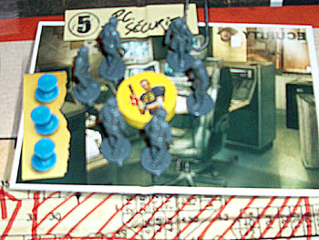 Nous procédons à la mise en place de nos personnages au gré de nos lancés de dés. Le premier tour ira vite, il n'y a personne dans le parking pour aller fouiller le camion et Stef est seule à posséder un personnage dans le Pc sécurité, l'élection du chef des vigiles ne sera qu'une simple formalité...Ce qui nous amène directement à l'arrivée des zombies et à nos premiers déplacements.